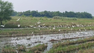 சேற்று உழவு மேற்கொள்ளும் வயல்வெளிகளில் உள்ள சிறு பூச்சிகளை உண்பதற்காக வெண்ணரைகள் பெருமளவில் குவிந்துள்ளன.