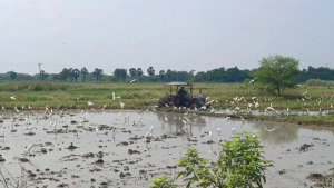 சேற்று உழவு மேற்கொள்ளும் வயல்வெளிகளில் உள்ள சிறு பூச்சிகளை உண்பதற்காக வெண்ணரைகள் பெருமளவில் குவிந்துள்ளன.
