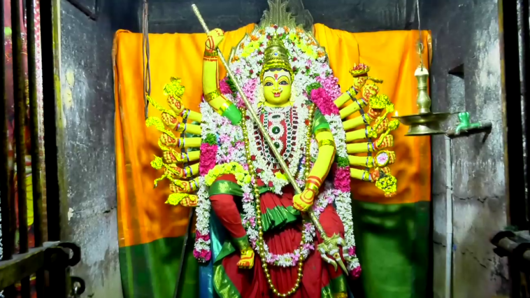 கேடயம், பரசு, மணி ஆகியவற்றைத் தரித்திருப்பார். இவளின் காலடியில் துண்டிக்கப்பட்ட மகிஷனின் கழுத்திலிருந்து இரத்தம் கசிந்து கொண்டிருப்பது போல் அமைந்திருக்கும் ஆலயங்களில் விஜயதசமி அன்று வன்னி மரத்துடன் கூடிய வாழை வெட்டுவது வழக்கம் இதேபோல் இவ்வாலயத்தில் வருடம் தோறும் அம்பு விடு உற்சவம் என்று நடைபெற்று வருகிறது.