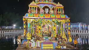சிறப்பாக அலங்காிக்கப்பட்ட தெப்பத்தில் சுவாமி தாயாா் எழுந்தருள கற்பூர ஆரத்தி காண்பிக்கப்பட்டது. தெப்பம் 12 முறை வலம் வந்தது. ஒவ்வொரு சுற்று முடிவிலும் 12 வகையான பழங்கள் பெருமாள் தாயாருக்கு சமா்பிக்கப்பட்டது.