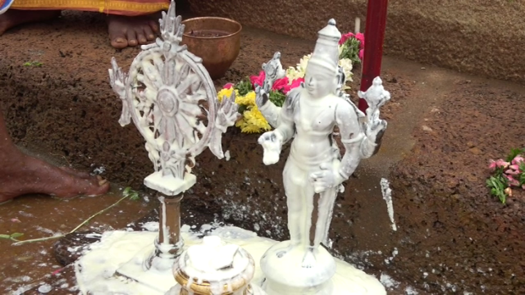 இதனைத் தொடர்ந்து பெருமாள் மற்றும் சக்கரத்தாழ்வுருக்கு திருமஞ்சன பொடி மஞ்சள் பால் இளநீர் சந்தனம் பன்னீர் உள்ளிட்ட பல வகையான நறுமண திரவியங்கள் கொண்டு சிறப்பு அபிஷேகங்கள் நடைபெற்றன.
