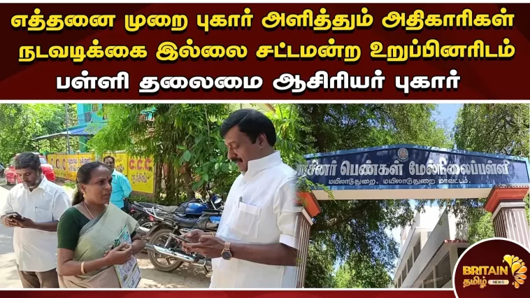 மயிலாடுதுறை மாவட்டம் மயிலாடுதுறை அரசினர் பெண்கள் உயர்நிலைப் பள்ளியில் சுமார் 850 மாணவ மாணவிகள் பயின்று வருகின்றனர். இந்தப் பள்ளி தேர்தலின் போது வாக்குப்பதிவு மையமாக செயல்பட்ட நிலையில் மின்சாரத்தை மாற்றி கொடுத்துள்ளனர் எதனால் அங்குள்ள ஒன்பது கட்டிடங்களில் ஒரு கட்டிடத்திற்கு மட்டுமே மின்னிணைப்பு மீண்டும் கொடுக்கப்பட்டது மீதமுள்ள எட்டு கட்டிடங்களில் மின் இணைப்பு துண்டிக்கப்பட்ட நிலையில் இதனை சரி செய்ய வேண்டும் என்று பொதுப்பணி துறையின் மின்சார பராமரிப்பு அதிகாரிகளுக்கு பள்ளி சார்பில் புகார் மனு அளிக்கப்பட்டு பலமுறை தொலைபேசி வாயிலாகவும் வலியுறுத்தப்பட்டது இருப்பினும் மின்சாரம் வழங்கப்படாத காரணத்தால் பள்ளியில் குடிநீர் இணைப்பு செயல்படவில்லை மேலும் மாணவிகள் மட்டும் பயிலும் இந்த பள்ளியில் கழிவறையில் தண்ணீர் இல்லாத காரணத்தால் மாணவிகள் மிகுந்த அவதிக்கு உள்ளாகி உள்ளனர். இன்று புத்தகம் வழங்கும் நிகழ்ச்சிக்கு வருகை புரிந்த மயிலாடுதுறை காங்கிரஸ் சட்டமன்ற உறுப்பினர் ராஜ்குமார் இடம் பள்ளி உதவி தலைமை ஆசிரியர் திருமதி லீலாவதி புகார் தெரிவித்தார்.