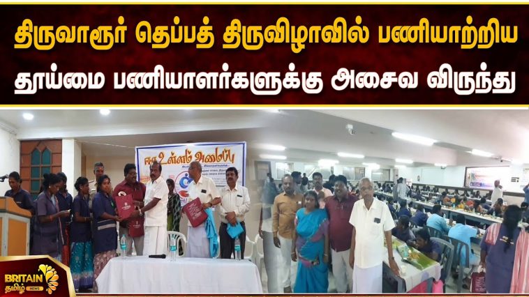 திருவாரூரில் உலக பிரசித்தி பெற்ற திருவாரூர் தியாகராஜர் திருக்கோவிலில் தெப்பத் திருவிழாவின் போது சிறப்பாக பணியாற்றிய நகராட்சி தூய்மை பணியாளர்களுக்கு நன்றி தெரிவிக்கும் விதமாக தனியார் அமைப்பு சார்பில் அசைவ விருந்து வழங்கப்பட்டது.