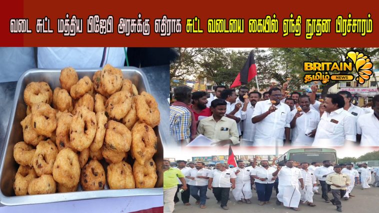 வடை சுட்ட மத்திய பிஜேபி அரசுக்கு எதிராக சுட்ட வடையை கையில் ஏந்தி நூதன பிரச்சாரம்