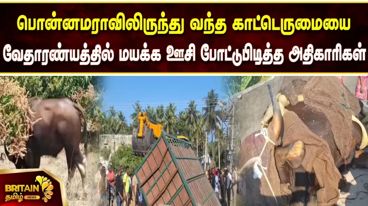 நேற்று புஷ்பவனம் பகுதிக்கு காட்டெருமை உலாவதாக தகவலை கிடைத்து அங்கு சென்று அதிகாரிகள் மாட்டை சுற்றி வளைத்து அதற்கு மயக்க ஊசி செலுத்து பின்பு கிரேன் மூலம் மாட்டை லாரியில் ஏற்றி மீண்டும் பொன்னமராவதிக்கு ஏற்றி அனுப்பி வைத்தனர்.