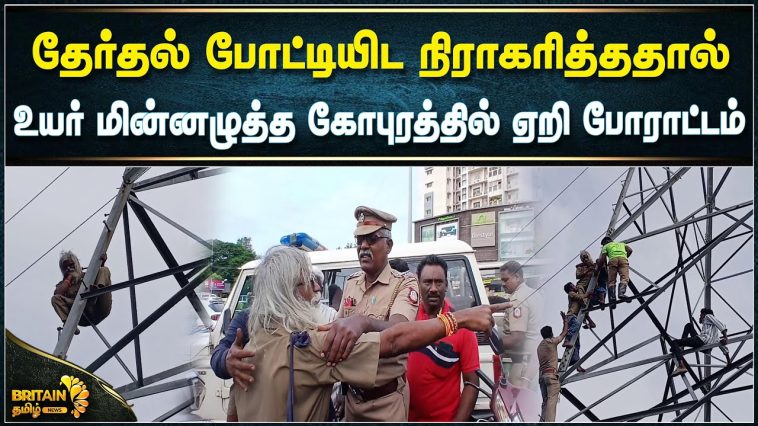 தேர்தலில் போட்டியிட நிராகரித்ததால் திருச்சியில் முதியவர் உயர் மின்னழுத்த கோபுரத்தில் ஏறி போராட்டம்