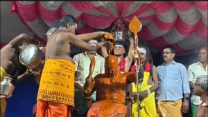 சாமியார் மீது ஊற்றிய மிளகாய் கரைசலை வீட்டிற்கு எடுத்துச் சென்று தெளித்தால் நன்மை உண்டாகும் என்பதால் போட்டி போட்டுக் கொண்டு எடுத்து சென்ற பக்தர்கள்.