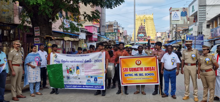 சங்கரன் கோவிலில் 15வது தேசிய வாக்காளர் தினத்தை முன்னிட்டு 500க்கும் மேற்பட்ட பள்ளி மாணவர்கள் பங்கேற்ற விழிப்புணர்வு பிரச்சார பேரணி நடைபெற்றது.