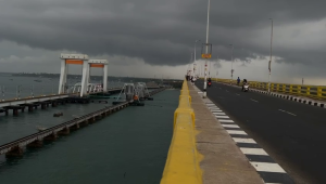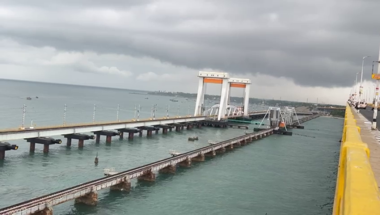கரு மேகங்கள் சூழ்ந்து இருண்டு காணப்படும் பாம்பன் பாலம்