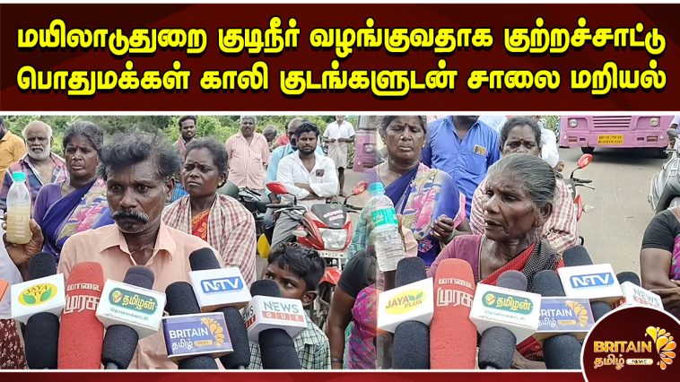 மயிலாடுதுறை மாவட்டம் குறிச்சி கிராமத்தில் தாழ்த்தப்பட்ட பகுதி மக்கள் வசிக்கும் பகுதியில் உபயோகப்படுத்த முடியாதபடி தரமற்ற குடிநீர் வழங்குவதாக குற்றச்சாட்டு பொதுமக்கள் காலி குடங்களுடன் சாலை மறியல்