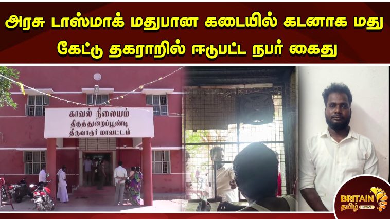 திருத்துறைப்பூண்டி அருகே அரசு டாஸ்மாக் மதுபான கடையில் கடனாக மது கேட்டு தகராறில் ஈடுபட்ட நபர்களின் வீடியோ சமூக வளைத்தளங்களில் வைரல் ஒருவர் கைது மேலும் ஒருவரை போலீசார் தேடி வருகின்றனர்