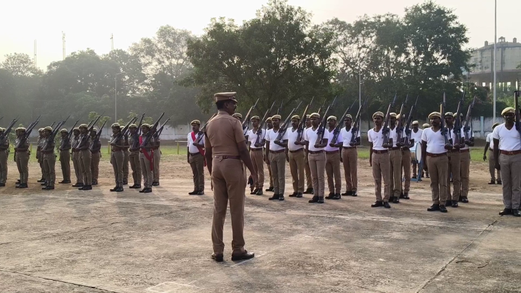 நாட்டின் 76 ஆவது குடியரசு தின விழாவை தஞ்சை ஆயுதப்படை மைதானத்தில் புதன்கிழமை போலீஸார் அணிவது ஒத்திகையில் ஈடுபட்டனர்.