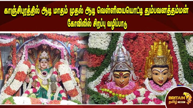 அந்தவகையில் கோவில் நகரமான காஞ்சிபுரத்தில் இன்று ஆடி மாதம் முதல் ஆடி வெள்ளியை முன்னிட்டு,பிரசித்தி பெற்ற அம்மன் கோவில்களில் சிறப்பு வழிப்பாடுகள் நடைபெற்றது. அதன் ஓர் பகுதியாக காஞ்சிபுரத்தில் கிராம குல தெய்வமாக விளங்கின்ற, பிரசித்தி பெற்ற ஸ்ரீ தும்பவனத்தம்மன் கோவிலில் இன்று ஆடி மாதம் ஆடி முதல் வெள்ளியை ஒட்டி வண்ண வண்ண மலர்களால் அலங்கரிக்கப்பட்டு, ஸ்ரீ தும்பவனத்தம்மனுக்கு சிறப்பு அபிஷேகங்கள் காலை முதலில் இருந்து நடைபெற்று வருகிறது.