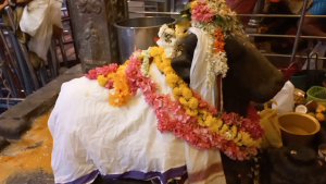 காரைக்கால் அடுத்த திருநள்ளாறில் அமைந்துள்ள உலக புகழ்பெற்ற ஸ்ரீ தர்ப்பாரண்யேஸ்வரர் தேவஸ்தானம் ஸ்ரீசனிபகவான் ஆலயத்தில் மாசி மாத தேய்பிறை பிரதோஷத்தை முன்னிட்டு ஸ்ரீநந்தி பகவானுக்கு சிறப்பு அபிஷேக ஆராதனை தொடர்ந்து மகாதீபாராதனை நடைபெற்றது.