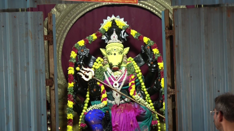 இக்கோவிலில் அமர்ந்த நிலையில் பிரமாண்டமாக ஸ்ரீ வராகி அம்மன் பக்தர்கள் அருள் பாலிக்கிறார் முன்னதாக விநாயகப் பெருமானுக்கும் உற்சவர் வராகி அம்மனையும் எழுந்தருள செய்து திருமஞ்சன பொடி மஞ்சள் பால் தயிர் சந்தனம் பன்னீர் உள்ளிட்ட பல வகையான திரவியங்கள் கொண்டு சிறப்பாக அபிஷேகம் நடைபெற்றன.