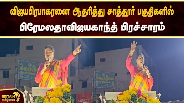 விருதுநகர் பாராளுமன்ற தொகுதியில் அதிமுக கூட்டணி கட்சியான தேமுதிக சார்பில் போட்டியிடும் வேட்பாளர் விஜய பிரபாகரனுக்கு ஆதரவாக தேமுதிக பொதுச்செயலாளர் பிரேமலதா சாத்தூர் சட்டமன்றத் தொகுதிக்குட்பட்ட பகுதிகளில் வாக்கு சேகரிப்பில் ஈடுபட்டார்.ஆலங்குளம், ஏழாயிரம் பண்ணை,ஒ.மேட்டுபட்டி, சாத்தூர் முக்குராந்தல் ஆகிய பகுதிகளில் வாக்கு சேகரிப்பில் ஈடுபட்டார்.அப்போது பேசிய பிரேமலதா கேப்டனின் தவ புதல்வர்  விஜய பிரபாகரனுக்கு கேப்டன் கண்ட அடுத்த வெற்றி சின்னமான முரசு சின்னத்தில் வாக்களித்து மகத்தான வெற்றியை தர வேண்டும்
