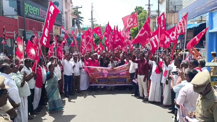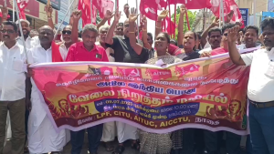 அகில இந்திய அளவில் அறிவிக்கப்பட்டுள்ள பொது வேலை நிறுத்த போராட்டத்தில் தமிழகத்தில் 13 தொழில் சங்கங்கள் ஆதரவு தெரிவித்துள்ள நிலையில் நாகப்பட்டினத்தில் பல்வேறு தொழிற்சங்கங்கள் சார்பில் பாரத ஸ்டேட் வங்கி முன்பு போராட்டம்; சாலையில் அமர்ந்து போராட்டத்தில் ஈடுபட்ட 500க்கும் மேற்பட்டவர்களை போலீசார் கைது செய்தனர்: