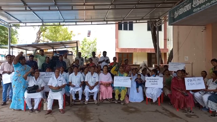 காரைக்கால் நலவழித் துறையில் பணிபுரியும் NRHM ஊழியர்கள் சம வேலைக்கு சம ஊதியம் வழங்கவும் பணி நிரந்தரம் செய்யக்கோரி அலுவலக வாசலில் தர்ணா போராட்டத்தில் ஈடுபட்டுள்ளனர்.
