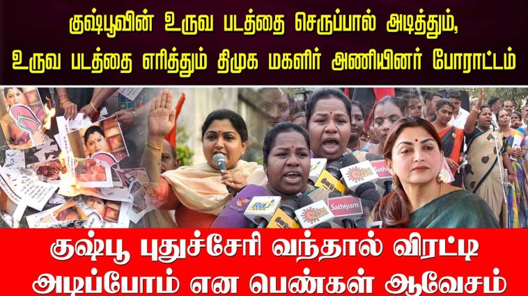 புதுச்சேரியில் குஷ்பூவின் உருவ படத்தை செருப்பால் அடித்தும், உருவ படத்தை எரித்தும் திமுக மகளிர் அணியினர் போராட்டம்