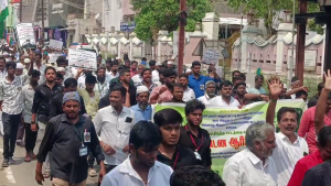 வக்பு வாரிய சட்ட திருத்த மசோதாவிற்கு எதிர்ப்பு பேரணியில் தேசிய கொடியுடன் சென்று ஆர்பாட்டம்