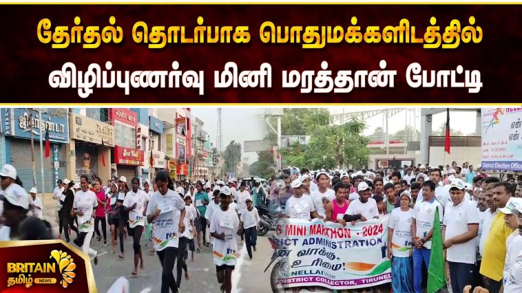 இந்த நிலையில் பொதுமக்களிடம் வாக்கு இயந்திரம் குறித்த விழிப்புணர்வு தேர்தலில் வாக்களிப்பதன் அவசியம் உள்ளிட்டவைகள் தொடர்பாக தொடர் விழிப்புணர்வு நிகழ்வுகள் நடத்தப்பட்டு வரும் நிலையில் நெல்லை மாவட்ட நிர்வாகம் சார்பில் நெல்லை பாளையங்கோட்டை வ உ சி மைதானத்தில் தேர்தல் விழிப்புணர்வு ஏற்படுத்தும் வகையில் மினி மராத்தான் போட்டிகளுக்கு ஏற்பாடு செய்யப்பட்டது.