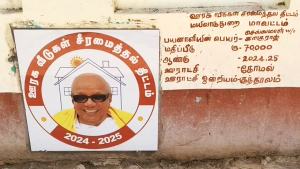 இந்த வீடுகள் பெரும்பாலும் மத்திய அரசின் பிரதம மந்திரி வீடு கட்டும் திட்டத்தின் கீழ் கட்டப்பட்டதாகும். இந்நிலையில் வீடுகளை சீரமைக்க சொற்ப நிதி ஒதுக்கிவிட்டு, அவற்றில் நான்கு சதுர அடி அளவில் முன்னாள் முதலமைச்சர் மு.கருணாநிதியின் புகைப்படத்துடன் கூடிய டைல்ஸ் சீரமைக்கப்பட்ட வீடுகளில் ஒட்டும்படி அதிகாரிகள் பயனாளிகளை வற்புறுத்துகின்றனர்.
