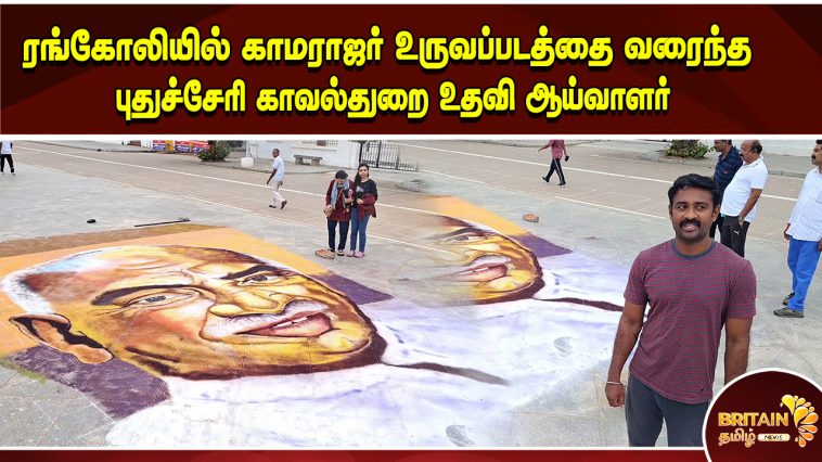 ரங்கோலியில் காமராஜர் உருவப்படத்தை வரைந்த புதுச்சேரி காவல்துறை உதவி ஆய்வாளர்