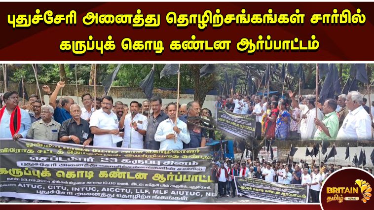 புதுச்சேரி அனைத்து தொழிற்சங்கங்கள் சார்பில் கருப்புக் கொடி கண்டன ஆர்ப்பாட்டம்