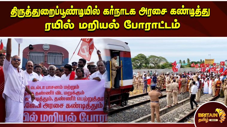 திருத்துறைப்பூண்டியில் காவிரி டெல்டா பாசனத்திற்கு தண்ணீர் திறக்க மறுக்கும் கர்நாடக அரசை கண்டித்து 300 மேற்பட்டோர் ரயில் மறியல் போராட்டத்தில் ஈடுபட்டு வருகின்றனர்.