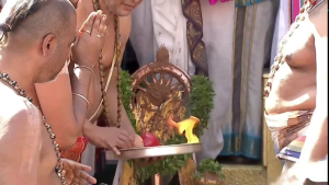 அதனை தொடர்ந்து சக்கரத்தாழ்வாரை கோவில் திருக்குளத்திற்குள் எடுத்துச் சென்ற அர்ச்சகர்கள் மூன்று முறை தண்ணீரில் மூழ்க செய்து சக்கரத்தாழ்வார் தீர்த்தவாரி நடத்தினர்.