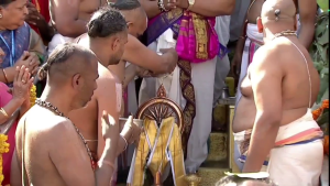 அதனை தொடர்ந்து சக்கரத்தாழ்வாரை கோவில் திருக்குளத்திற்குள் எடுத்துச் சென்ற அர்ச்சகர்கள் மூன்று முறை தண்ணீரில் மூழ்க செய்து சக்கரத்தாழ்வார் தீர்த்தவாரி நடத்தினர்.