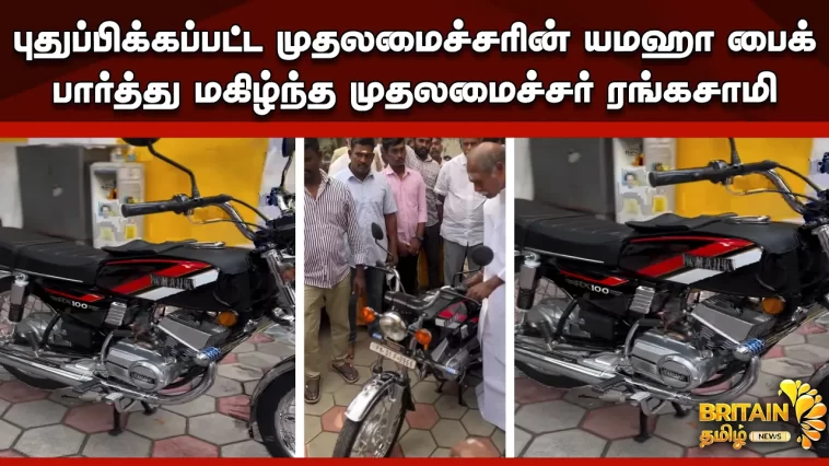 புதுப்பிக்கப்பட்ட முதலமைச்சரின் யமஹா பைக். இன்பம், துன்பம் உற்ற நண்பனாய் இருந்த தனது பைக்கை ஆசையாய் பார்த்து மகிழ்ந்த முதலமைச்சர் ரங்கசாமி.