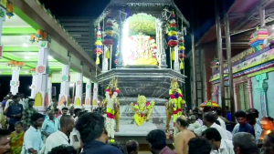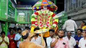 தொடர்ந்து மகாதீபாரதனை,சத்திரங்கள் கொண்டு சோடச உபச்சாரங்கள், கும்ப தீபம்,பஞ்சமுக தீபாரதனை, கற்பூர ஆர்த்தி ஆகியவை காட்டப்பட்டன. உட்பிரகாரம் வந்து வெள்ளித் தேரில் எழுந்தருளினர்.