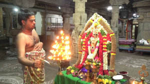 முன்னதாக உற்சவர் அம்பாளை சர்வ அலங்காரத்தில் எழுந்தருள செய்தனர் தொடர்ந்து அம்பாளுக்கு தீப தூப ஆராதனை காண்பித்து கோபுர தீபம் கும்ப தீபம் நாகதீபம் தீபம் காண்பித்து உதிரி புஷ்பங்களால் அர்ச்சனைகள் செய்யப்பட்டன.