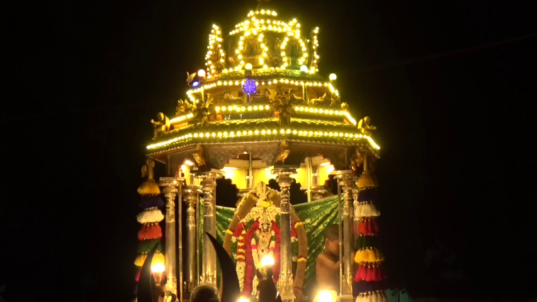 தொடர்ந்து ஏழுமுக தீபாராதனை காண்பிக்கப்பட்டவுடன் மங்கள வாத்தியங்களுடன் சிவகாமி அம்பாளை மின்விளக்குகளால் அலங்கரிக்கப்பட்ட வெள்ளி ரதத்தில் எழுந்தருள செய்தனர்.