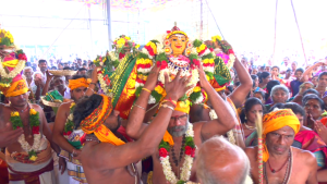 இதைத் தொடர்ந்து மங்கள வாத்தியங்களுடன் கடம் புறப்பாடு நடைபெற்று கோவிலை சுற்றி வலம் வந்து வேத மந்திரங்கள் முழங்க விமான கலசங்களுக்கும் மூலவர் அம்மனுக்கும் கலசத்தில் உள்ள புனித நீரால் அபிஷேகம் செய்து தீப ஆராதனை காண்பிக்கப்பட்டன.