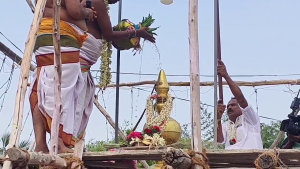 அப்போது ட்ரோன் கொண்டு பக்தர்கள் மீது புனித நீர் தெளிக்கப்பட்டது.