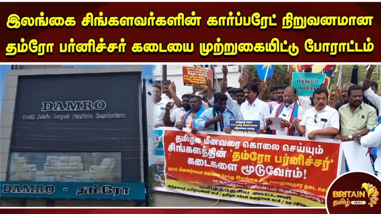 இலங்கை சிங்களவர்களின் கார்ப்பரேட் நிறுவனமான தம்ரோ பர்னிச்சர் கடையை முற்றுகையிட்டு போராட்டம்