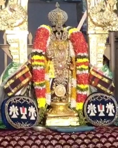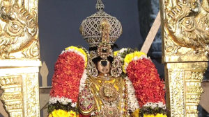 2 வட முத்து மாலை; மரகத பச்சை கிளி மாலை அணிந்து வெண் பட்டு அணிந்து அதன் மேல் மஞ்சள் நிற கபா என்னும் வஸ்திரம் அணிந்து பின் சேவையாக – பங்குனி உத்திர பதக்கம் – புஜ கீர்த்தி அணிந்து சேவை சாதிக்கிறார்.