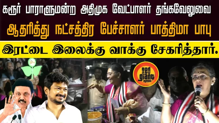 கரூர் பாராளுமன்ற அதிமுக வேட்பாளர் தங்கவேலுவை ஆதரித்து நட்சத்திர பேச்சாளர் பாத்திமா பாபு இரட்டை இலைக்கு வாக்கு சேகரித்தார்.