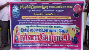 இதன் ஒரு பகுதியாக தேனி பங்களாமேடு பகுதியில் உள்ள மாநில நெடுஞ்சாலைத்துறை கோட்ட பொறியாளர் அலுவலகம் முன்பு நெடுஞ்சாலை துறை சாலை பணியாளர் சங்கத்தினர் 5 அம்ச கோரிக்கைகளை வலியுறுத்தி கையில் தீப்பந்தம் ஏந்தி தர்ணா போராட்டத்தில் ஈடுபட்டனர்.