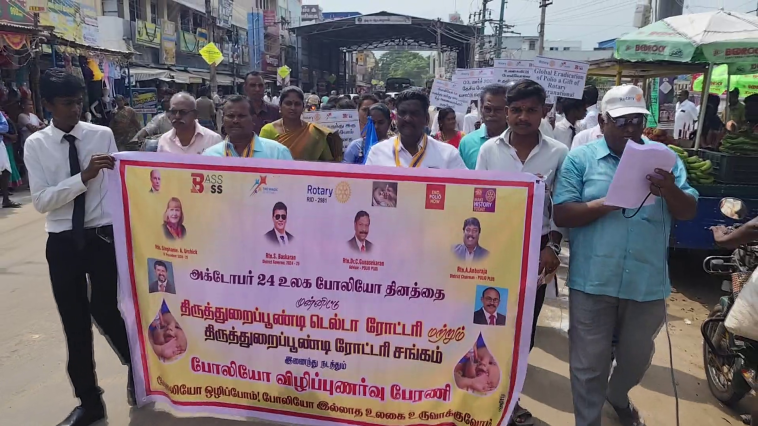திருத்துறைப்பூண்டியில் உலக போலியோ ஒழிப்பு தினத்தை முன்னிட்டு மாணவர்கள் விழிப்புணர்வு பேரணி நடைபெற்றது