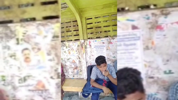 பொதுவெளியில் பேருந்து நிழற்குடையில் அமர்ந்து சிகரெட் பிடிக்கும் மாணவர்கள்