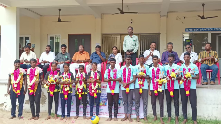 அவர்களை பள்ளி நிர்வாகிகள் மாவட்ட வாலிபால் சங்க பொறுப்பாளர்கள் உடல் கல்வி இயக்குனர்கள் ரோட்டரி சங்க நிர்வாகிகள் ஆகியோர் சால்வை அணிவித்து மாலை அணிவித்து வரவேற்றனர்.