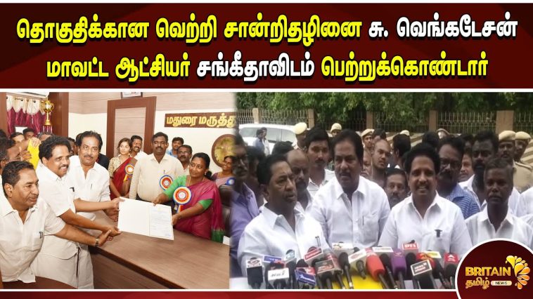 தொகுதிக்கான வெற்றி சான்றிதழினை சு. வெங்கடேசன் மாவட்ட ஆட்சியர் சங்கீதாவிடம் பெற்றுக்கொண்டார்