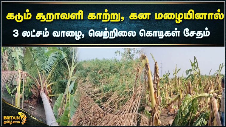 திருச்சி மாவட்டம் தொட்டியம் அருகே காட்டுப்புத்தூரில் நேற்று இரவு கடும் சூறாவளி காற்று மற்றும் கன மழையினால் வாழை, வெற்றிலை, தென்னை, சோளம் உள்ளிட்ட சாகுபடி பயிர்கள் கடும் சேதமடைந்தன.