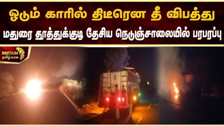 மதுரை தூத்துக்குடி தேசிய நெடுஞ்சாலையில் ஓடும் காரில் திடீரென தீ விபத்து