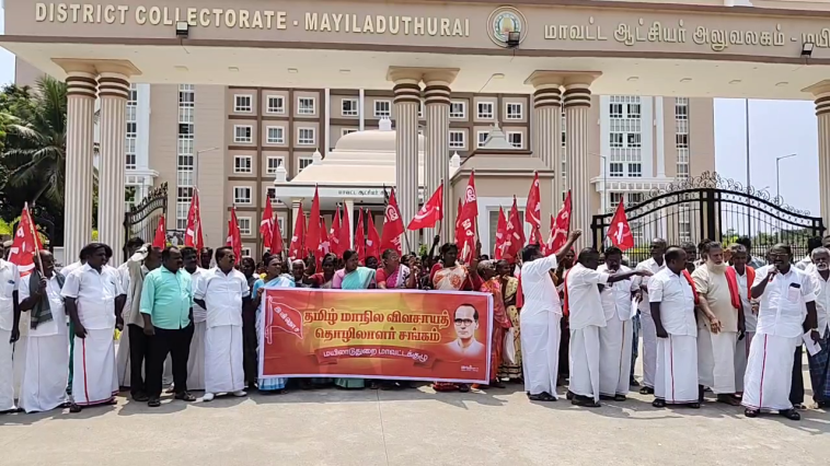 மயிலாடுதுறை மாவட்டம்,மயிலாடுதுறை மாவட்ட ஆட்சியர் அலுவலகம் எதிரில் இந்திய கம்யூனிஸ்ட் கட்சியின் தமிழ் மாநில விவசாய தொழிலாளர் சங்கத்தின் சார்பில் ஆர்ப்பாட்டம் நடைபெற்றது.