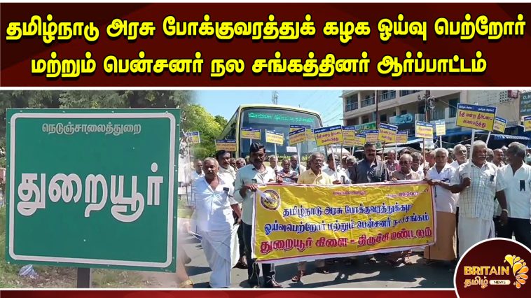 தமிழ்நாடு அரசு போக்குவரத்துக் கழக ஓய்வு பெற்றோர் மற்றும் பென்சனர் நல சங்கத்தினர் தங்களது கோரிக்கைகளாக ஓய்வூதிய பணப் பழங்களை உடனடியாக வழங்க கோரியும் ஒன்பது வருட காலமாக வழங்கப்படாமல் உள்ள அகவிலை படியை உடனடியாக வழங்க கோரியும் பென்சன் தொகையை உயர்த்தி வழங்க கோரியும் தங்களது வாரிசுகளுக்கு வேலை வழங்க கோரியும் ஓய்வு பெற்றோருக்கு இலவச மருத்துவ திட்டத்தை வழங்கிட கோரியும் உடல்நல படியை உயர்த்தி வழங்க கோரியும் நூறு நாளில் ஓய்வூதியரின் பிரச்சினையை தீர்ப்பேன் என்று வாக்குறுதி அளித்த தமிழக முதல்வருக்கு கண்டனம் தெரிவித்தும் துறையூர் பேருந்து நிலையம் முன்பாக ஆர்ப்பாட்டம் செய்தனர்.