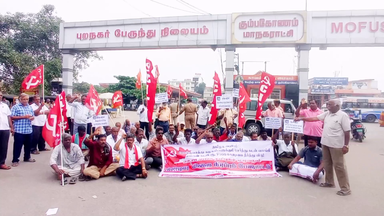 தஞ்சாவூர் மாவட்டம் கும்பகோணத்தில் புதிய பேருந்து நிலையம் முன்பு தமிழக அரசு போக்குவரத்துக் கழகத்தில் உள்ள போக்குவரத்து கழக தொழிலாளர்களின் ரூ.7500 கோடி கடனை வழங்கிட வலியுறுத்தி காரல் மார்க்ஸ் தலைமையில் சாலை மறியல் போராட்டத்தில் ஈடுபட்டனர்.
